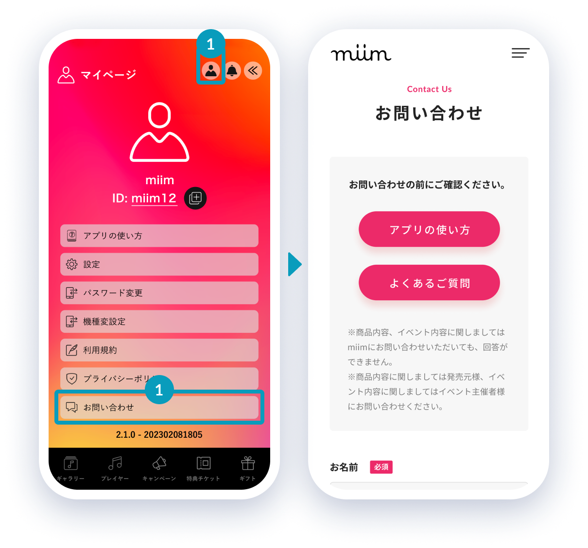 画面上部の人物アイコンを押し、マイページからお問い合わせを選択するとmiimホームページのお問い合わせフォームへ移動するので、そちらからお問い合わせください。