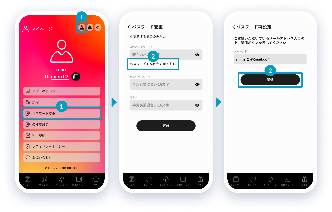 パスワードを忘れた方はこちらを押し、登録メールアドレスを確認の上、「送信」ボタンを押すと登録メールアドレスにmiimからメールが届きます。miimアプリにメールに記載されている認証コードと新しく登録するパスワード、パスワードの確認をそれぞれ入力し、「更新」ボタンを押すと新しいパスワードに変更されます。